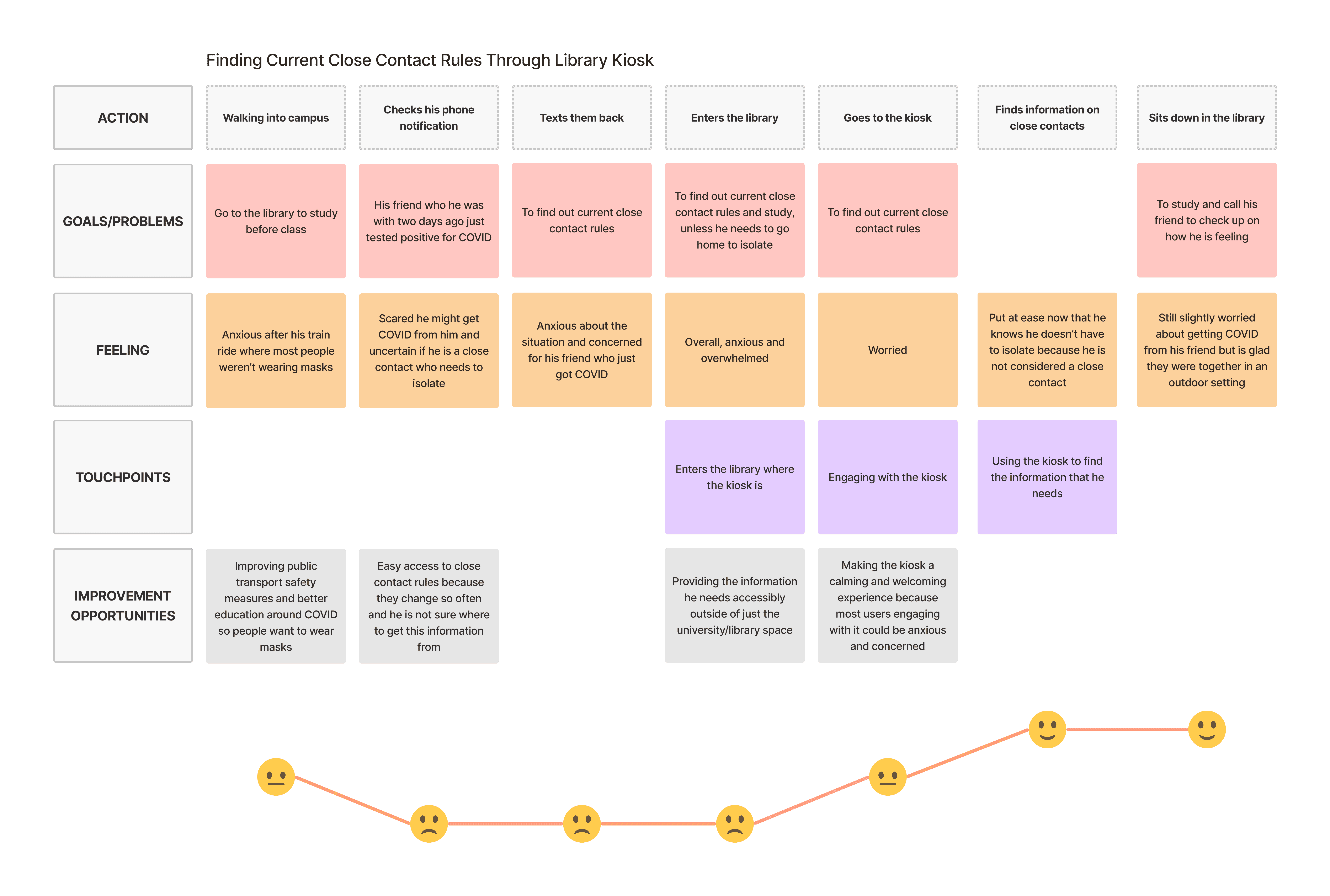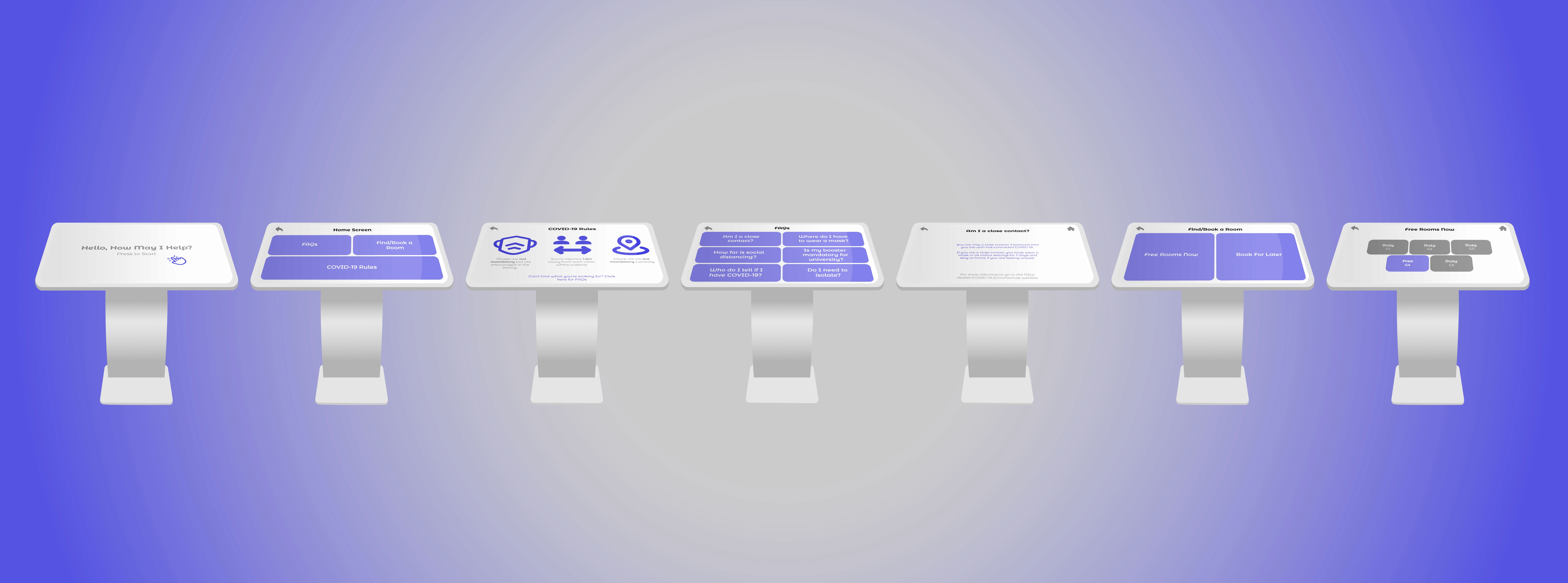 This project is born from a brief requiring technology for a COVID-safe space. My interactive technology was a library digital kiosk for introducing better COVID-safe measures in a university library setting. The high-fidelity prototype allows students to book library spaces, safely social distance, and access current COVID health mandates with ease. This assessment required a lot of research on the user group and problem space to create an effective outcome. Through empathy maps, user journeys, user personas, cultural probes, scenarios, task flows, and storyboards, I was able to position this technology within the user group. Multiple rounds of user testing significantly contributed to the final outcome and allowed for a sleek, minimalist, user-friendly high-fidelity prototype.