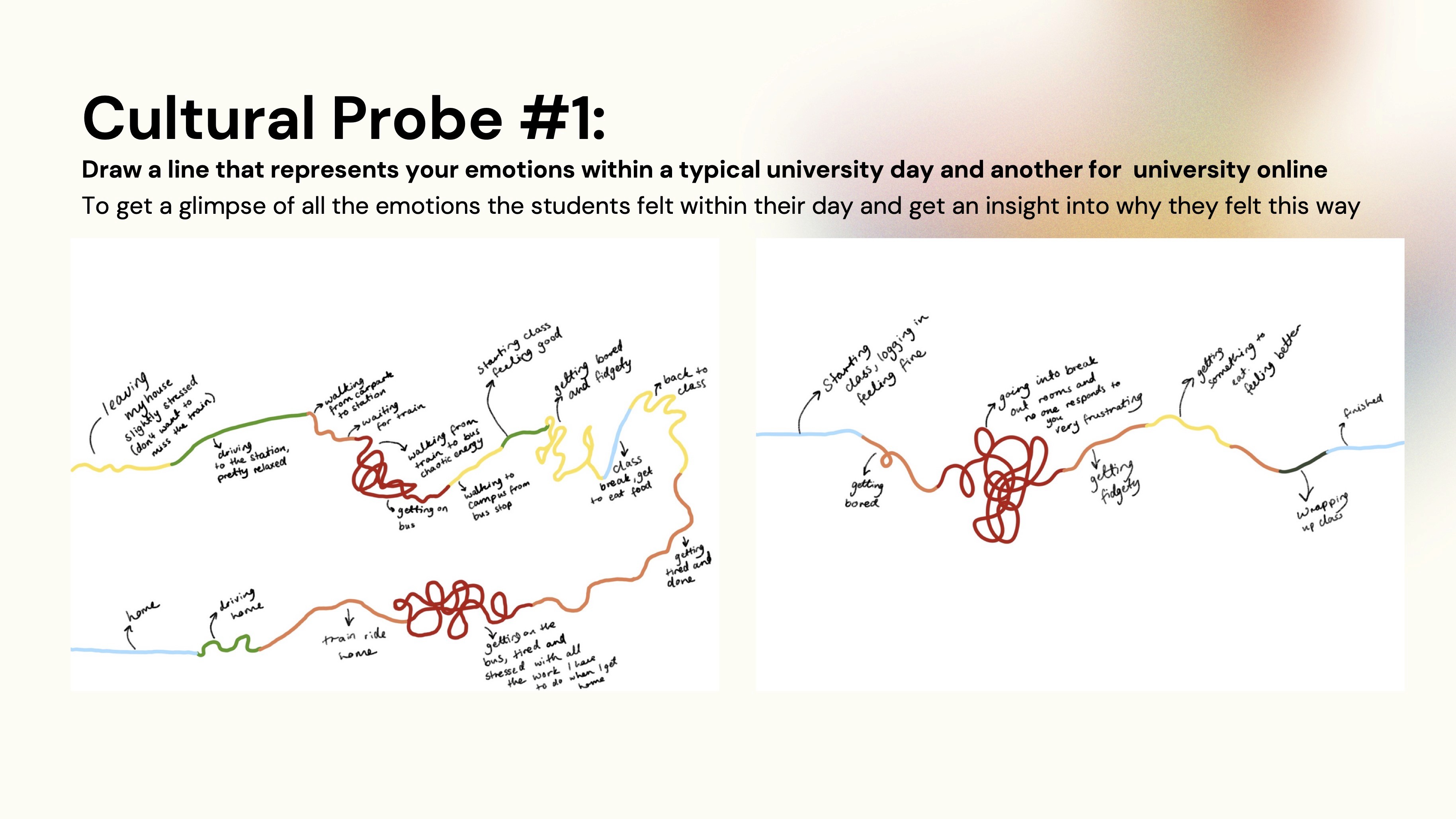 Stage 1 involved collecting as much user research as possible. Casting my net wide allowed for optimum outcomes and promoted user empathisation. Stage 1 consisted of cultural probing through various activities, story boarding, user personas, and empathy mapping.